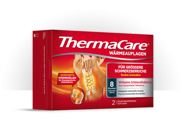 ThermaCare® HeatWraps for larger painful areas are particularly suitable for treating large painful areas. The skin-friendly wraps with 13 patented heat cells can be used flexibly and are attached to the skin with four adhesive points.