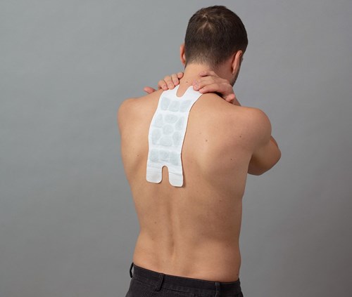 Free your upper body and carefully place the heat wrap with the adhesive surfaces facing the skin on the painful area of the shoulder, spine or upper back and fix the 2 upper adhesive surfaces on the skin from above.
