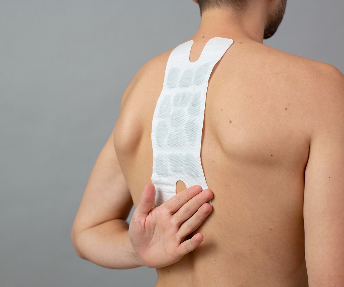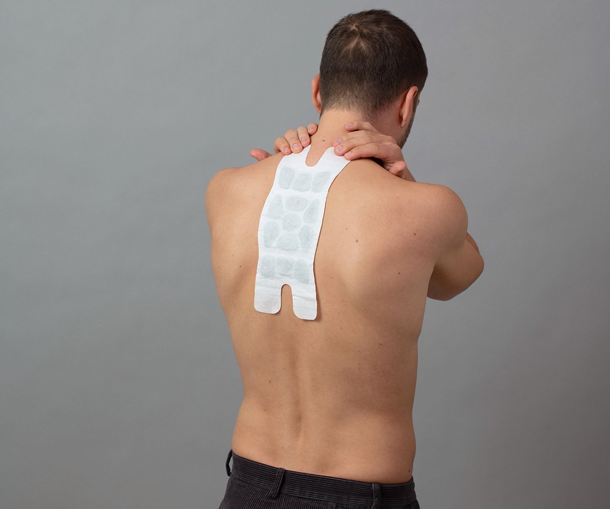 Free your upper body and carefully place the heat wrap with the adhesive surfaces facing the skin on the painful area of the shoulder, spine or upper back and fix the 2 upper adhesive surfaces on the skin from above.