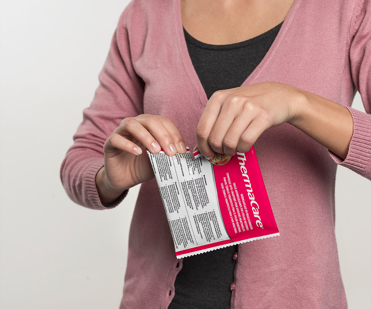 Open the airtight packaging directly before use and remove the ThermaCare® HeatWrap. Upon contact with oxygen, the heating of the heat cells begins.
